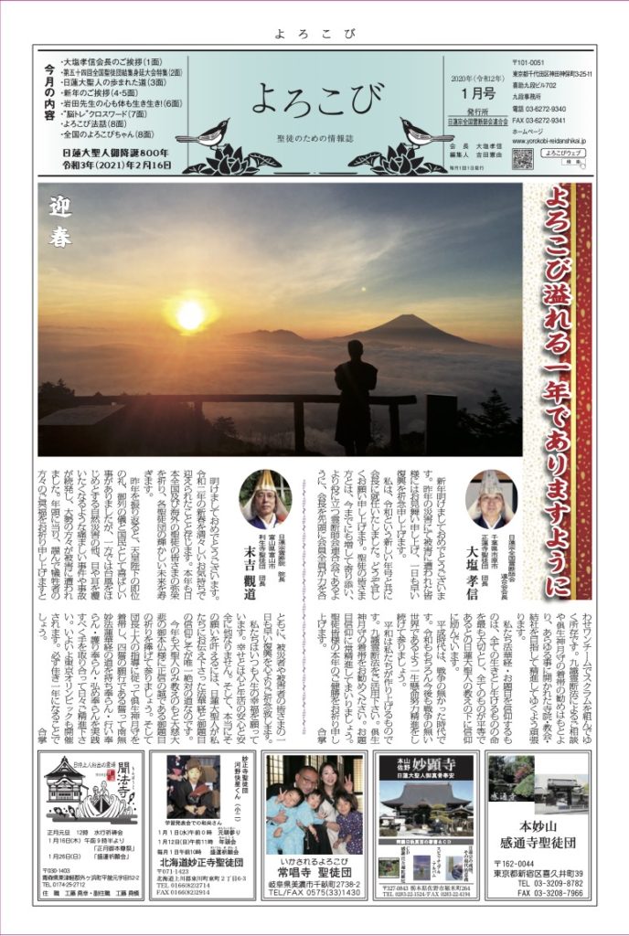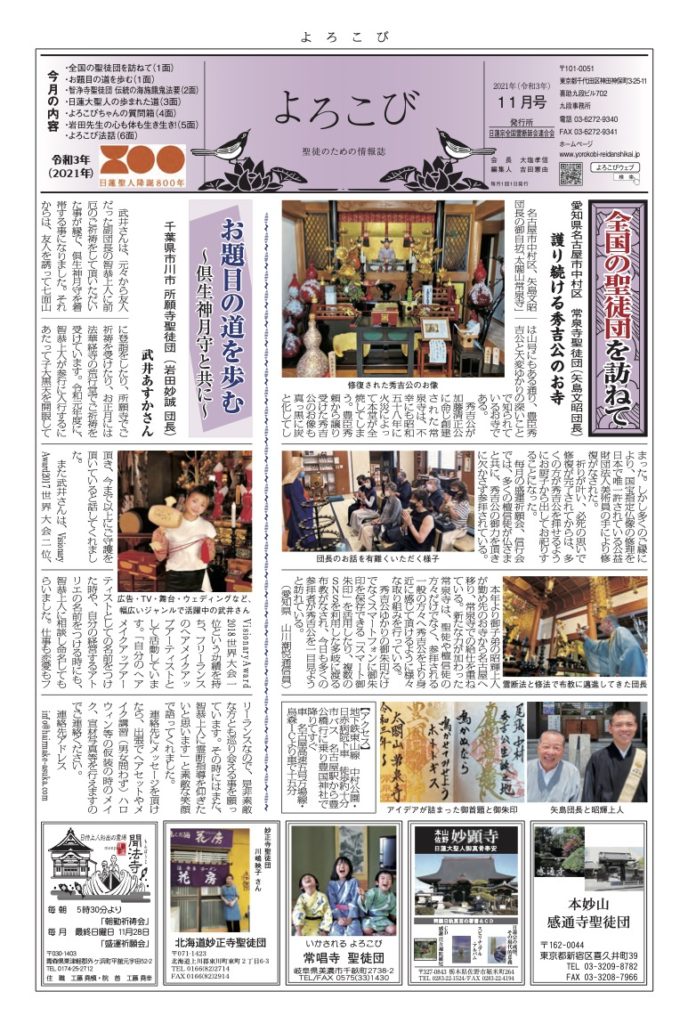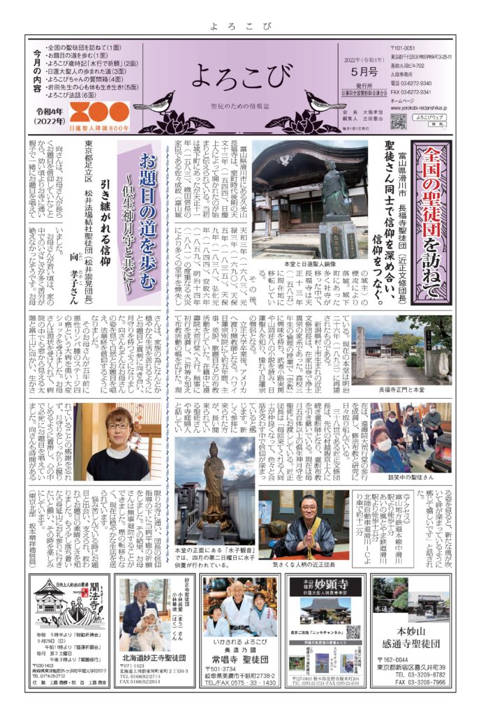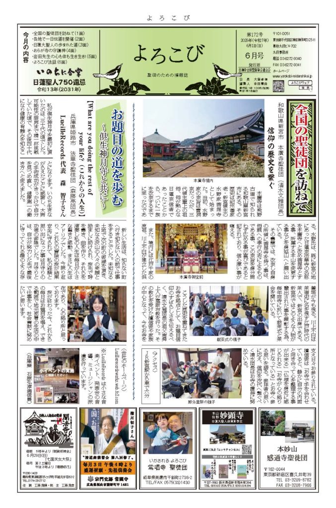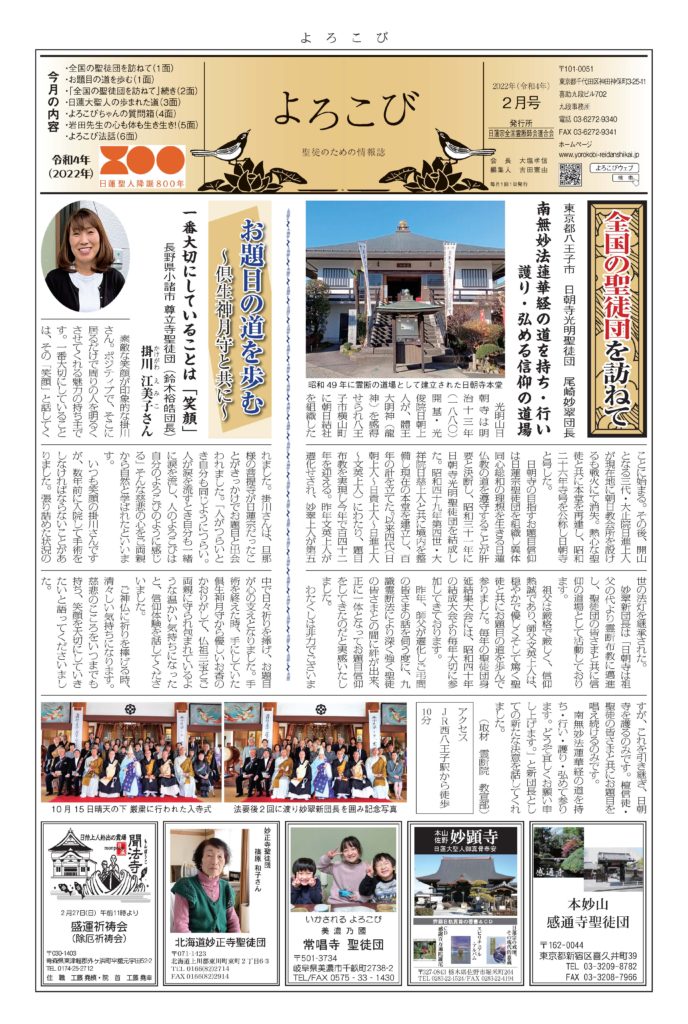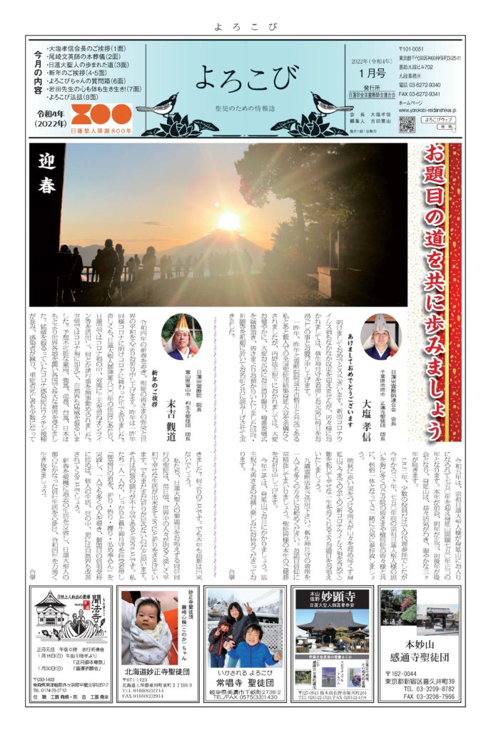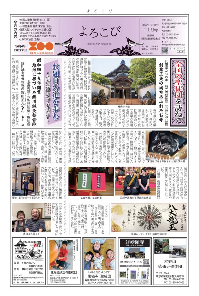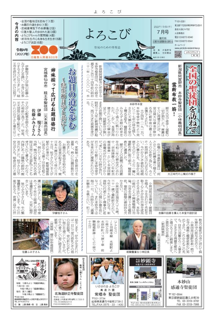 日蓮聖人のお言葉(3面・4面)や、霊断師による法話(6面)、など「一人のよろこびはみんなのよろこび、みんなのよろこびは一人ために」として購読するすべて人々が笑顔になれるようよろこび溢れる情報紙を目指しています