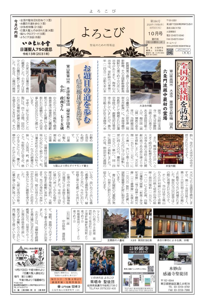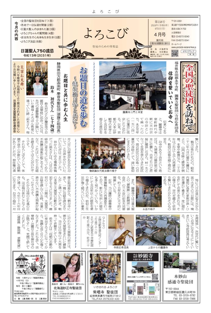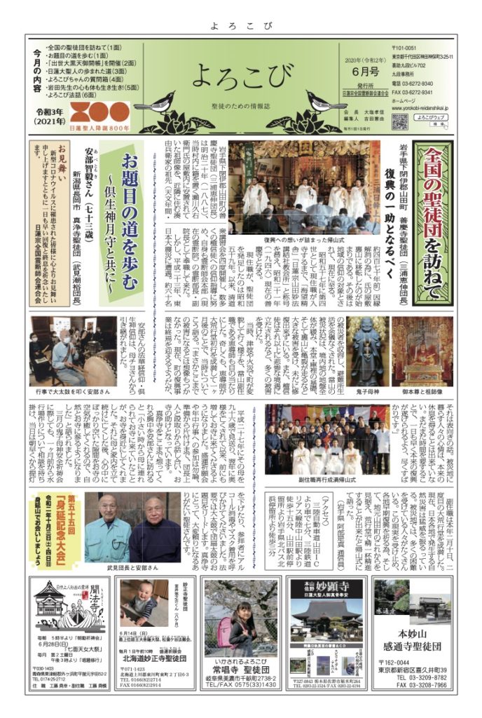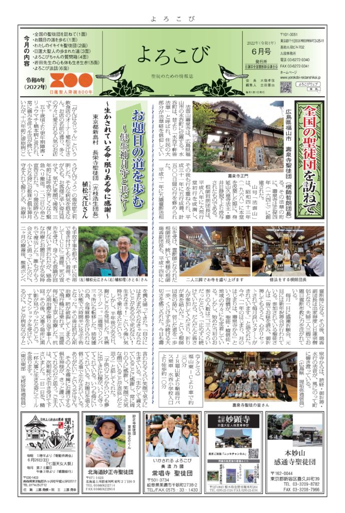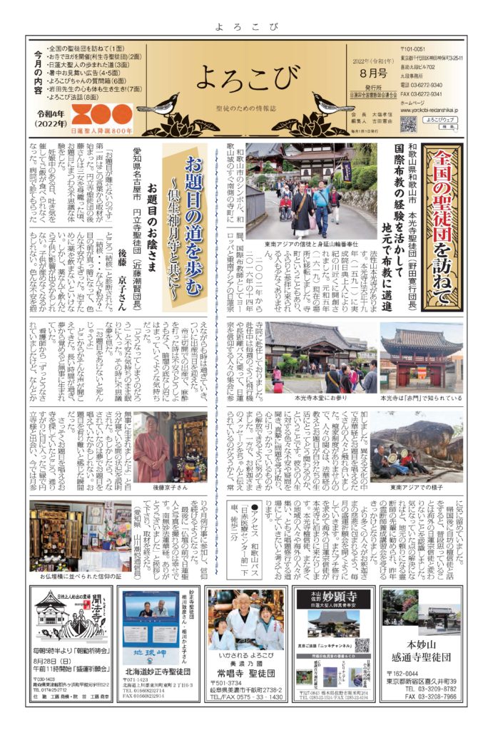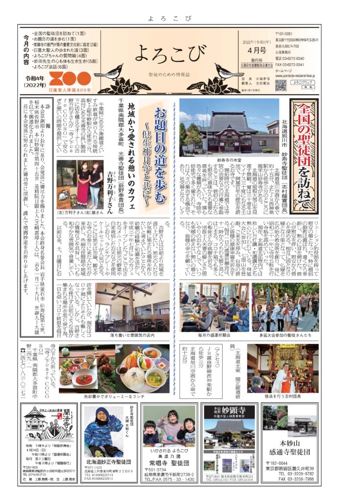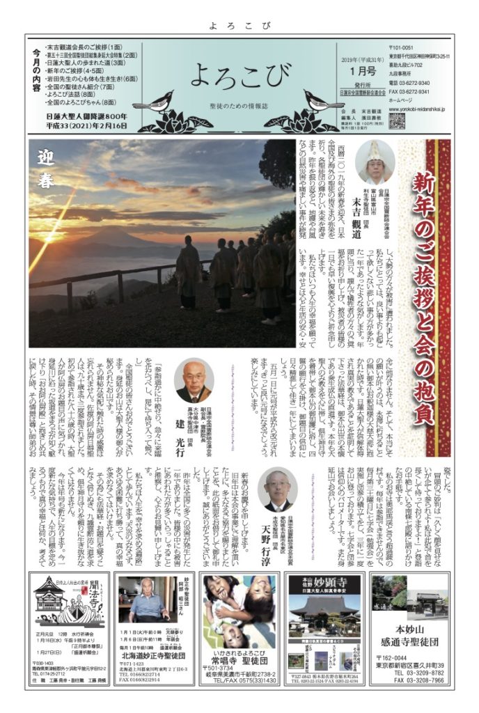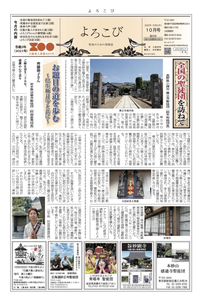日蓮聖人のお言葉(3面・4面)や、霊断師による法話(6面)、など「一人のよろこびはみんなのよろこび、みんなのよろこびは一人ために」として購読するすべて人々が笑顔になれるようよろこび溢れる情報紙を目指しています