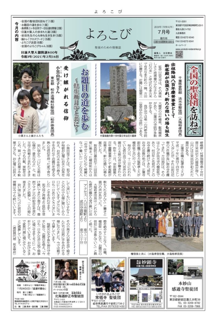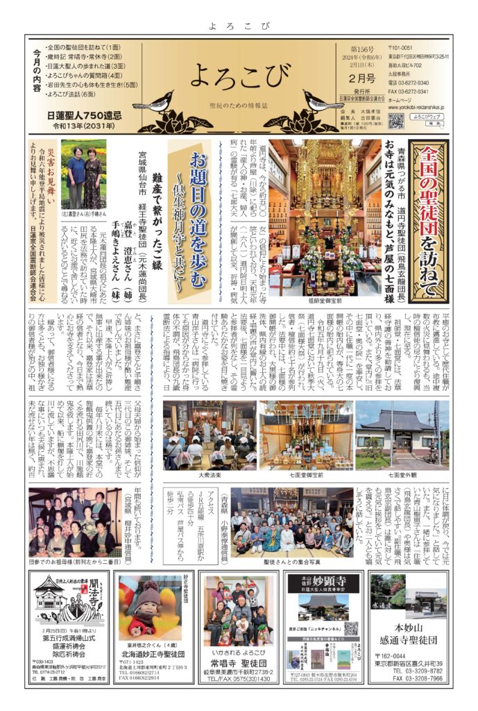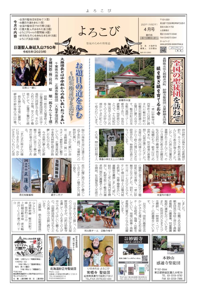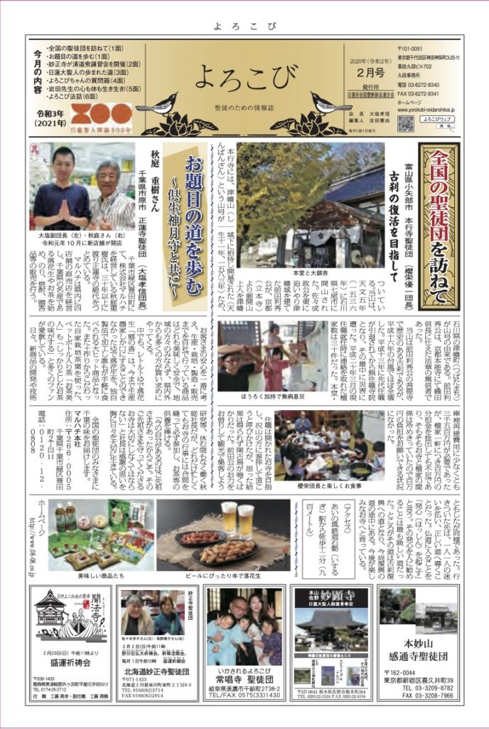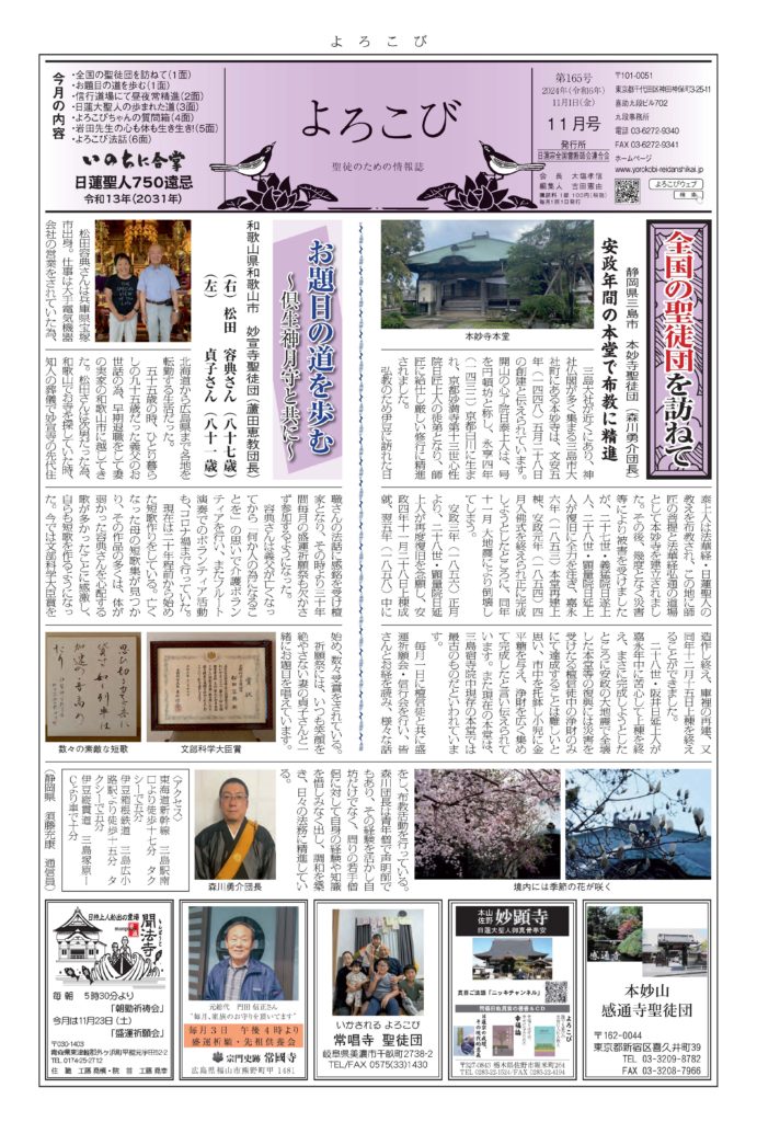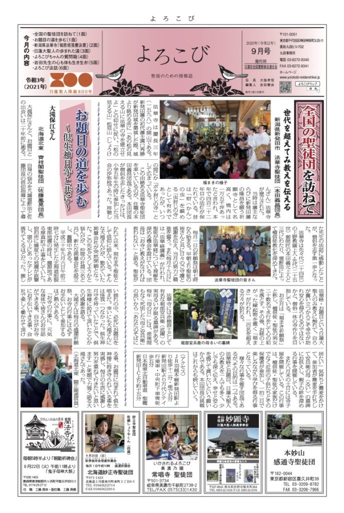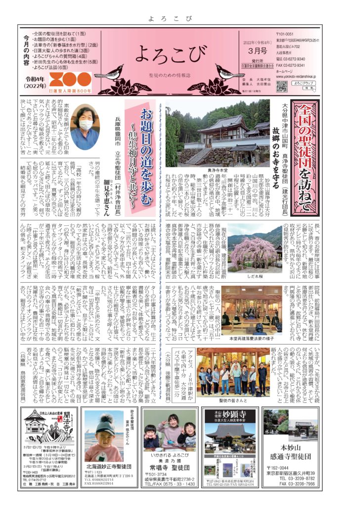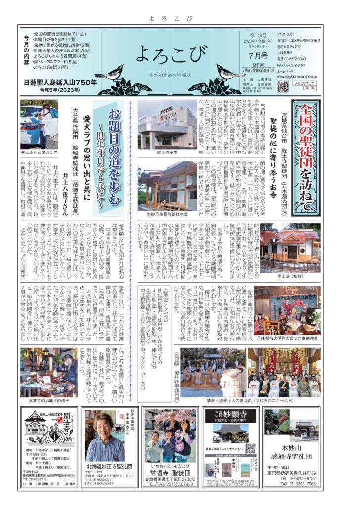 日蓮聖人のお言葉(3面・4面)や、霊断師による法話(6面)、など「一人のよろこびはみんなのよろこび、みんなのよろこびは一人ために」として購読するすべて人々が笑顔になれるようよろこび溢れる情報紙を目指しています