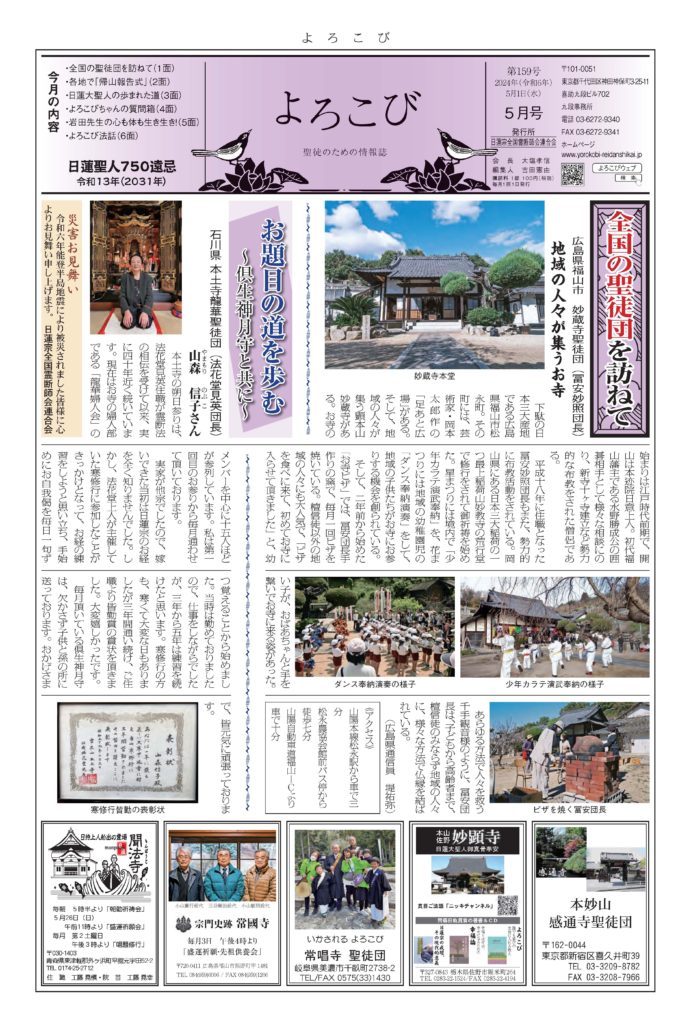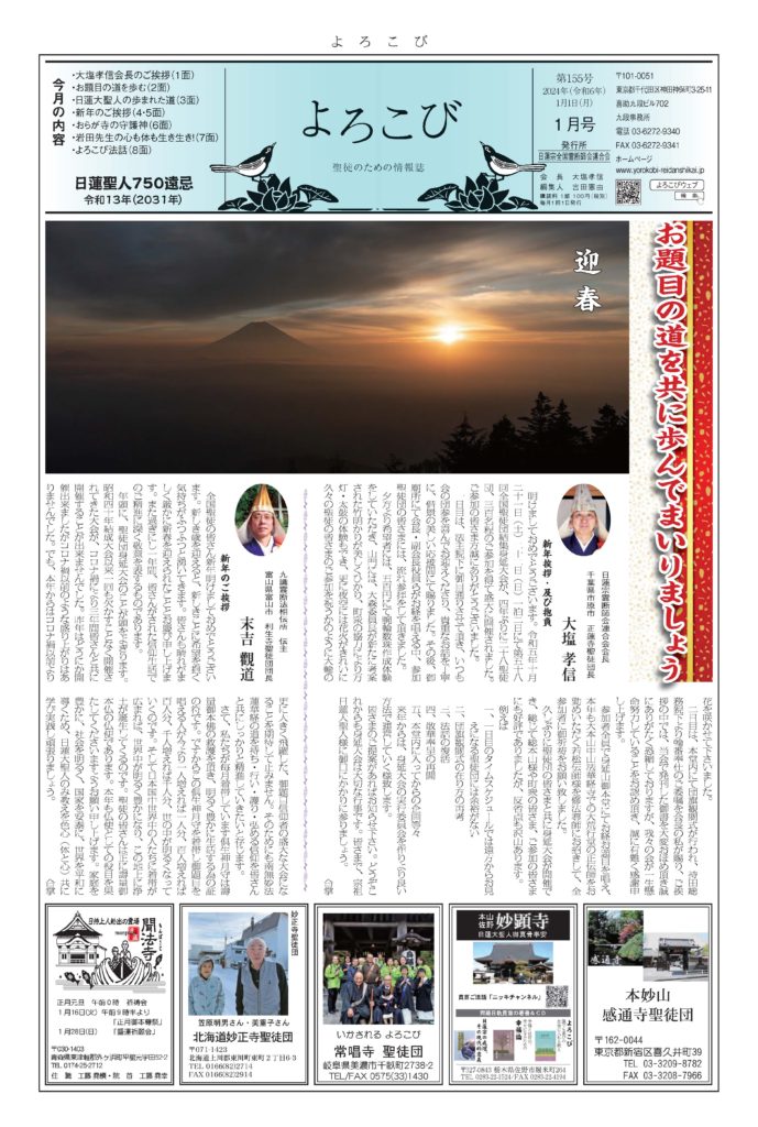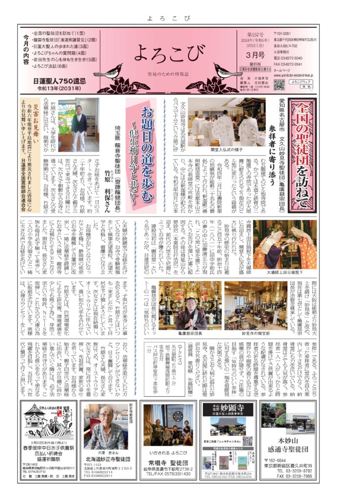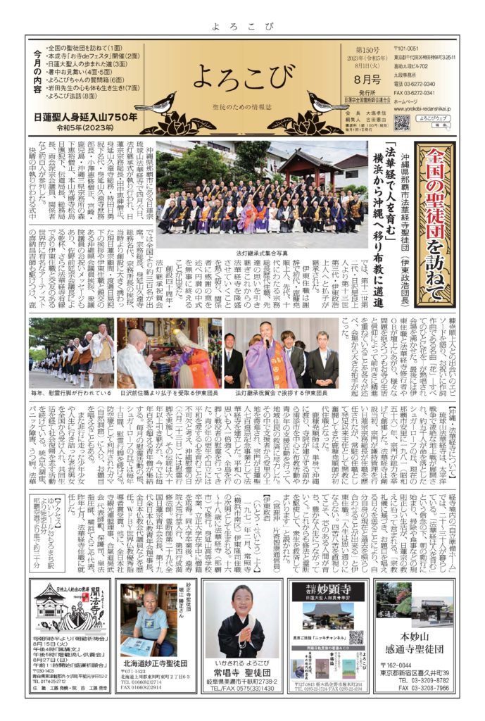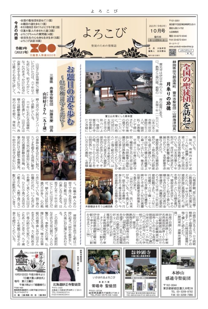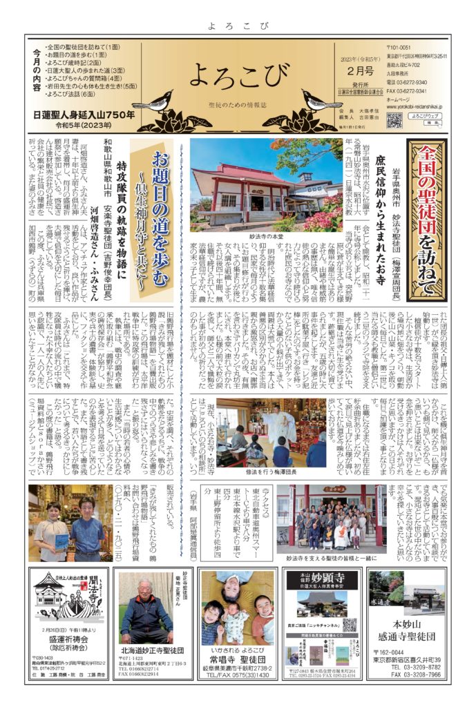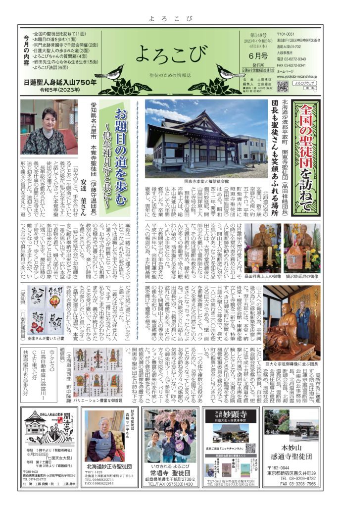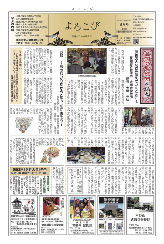 日蓮聖人のお言葉(3面・4面)や、霊断師による法話(6面)、など「一人のよろこびはみんなのよろこび、みんなのよろこびは一人ために」として購読するすべて人々が笑顔になれるようよろこび溢れる情報紙を目指しています
