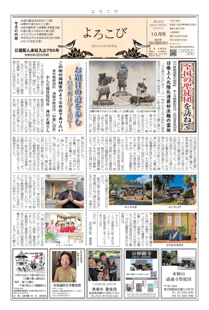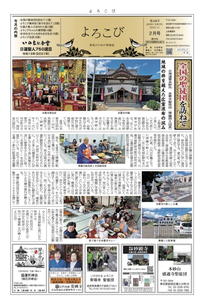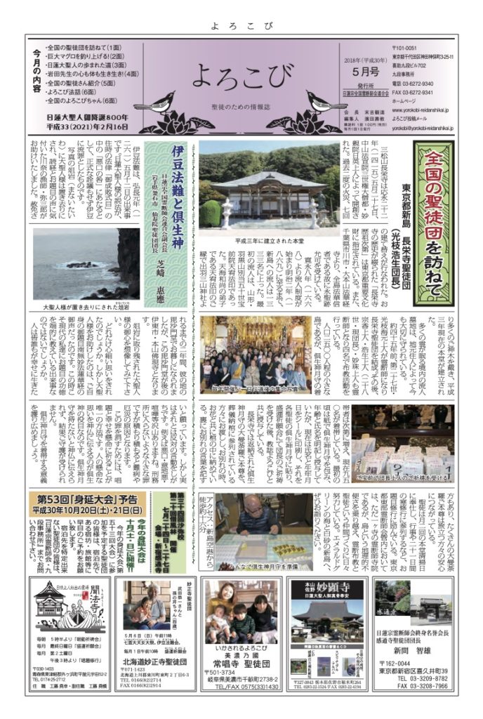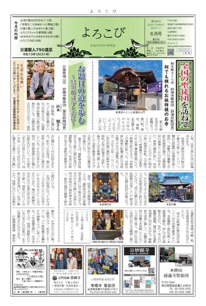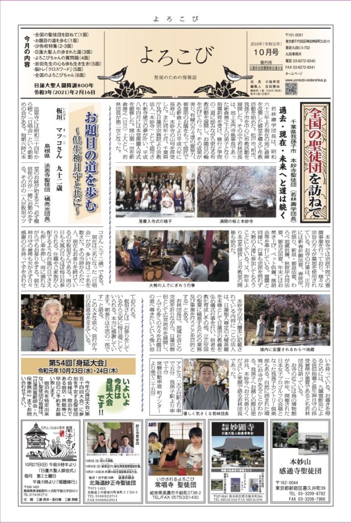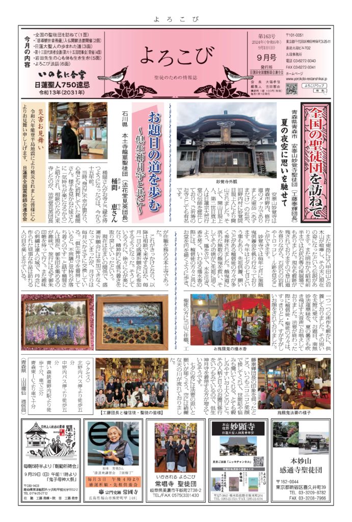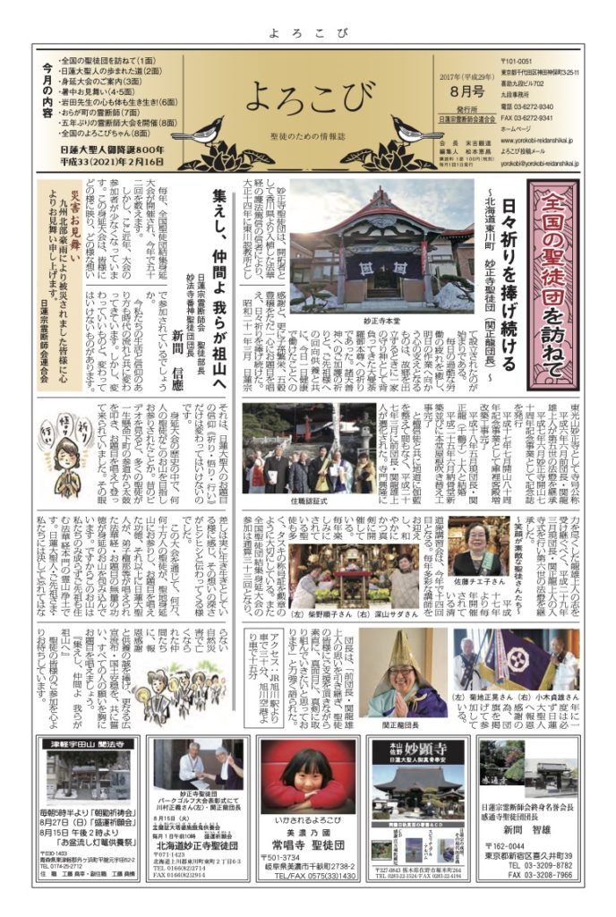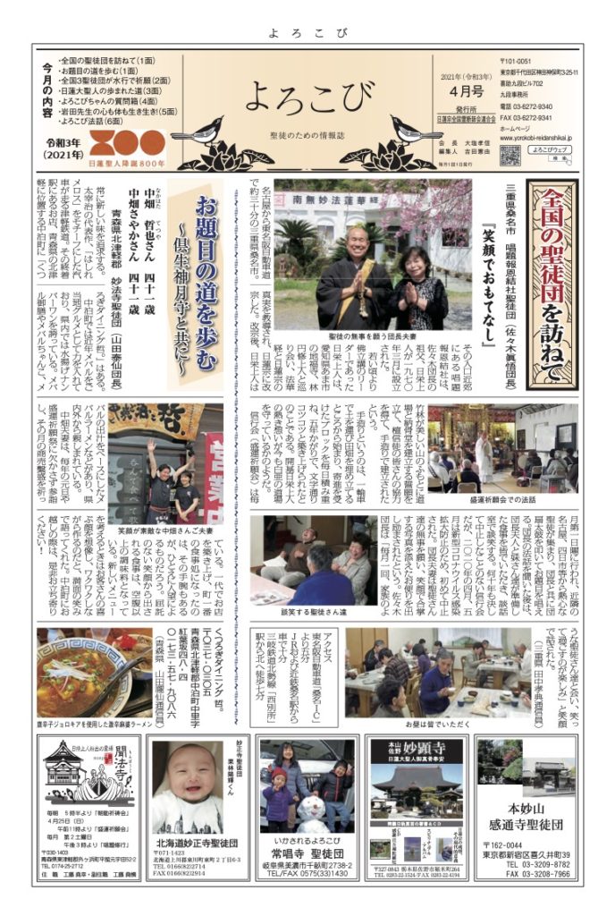 日蓮聖人のお言葉(3面・4面)や、霊断師による法話(6面)、など「一人のよろこびはみんなのよろこび、みんなのよろこびは一人ために」として購読するすべて人々が笑顔になれるようよろこび溢れる情報紙を目指しています