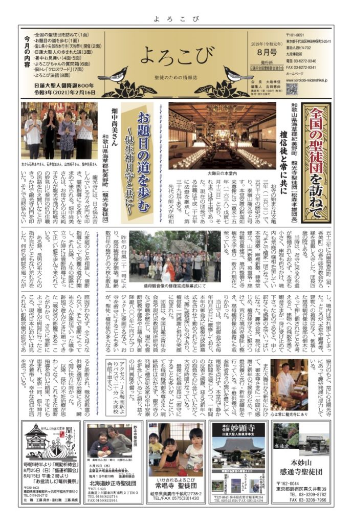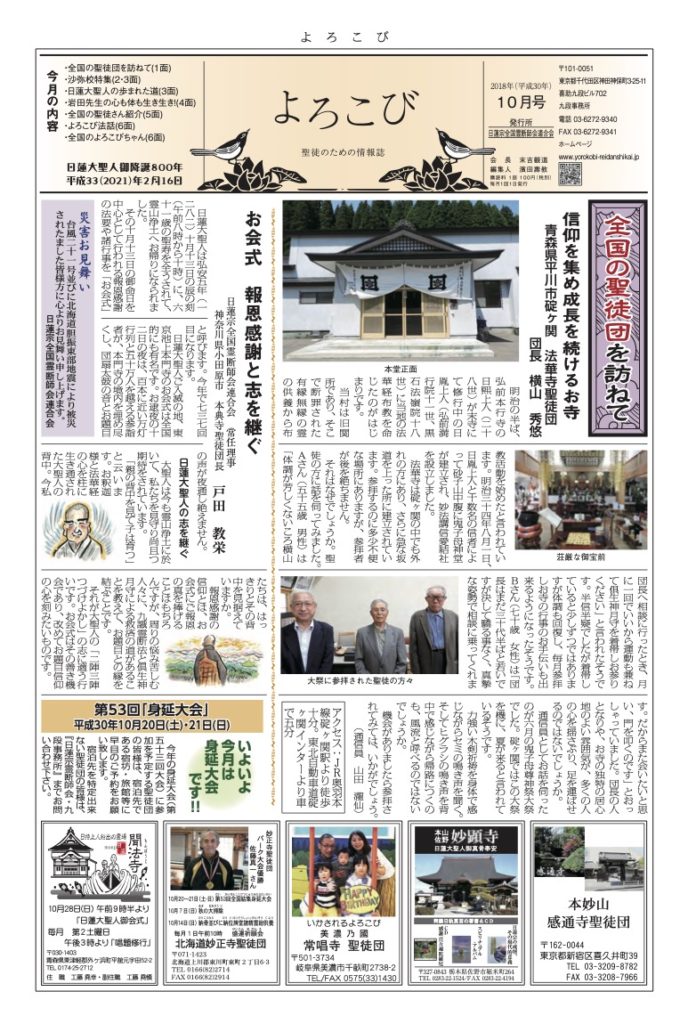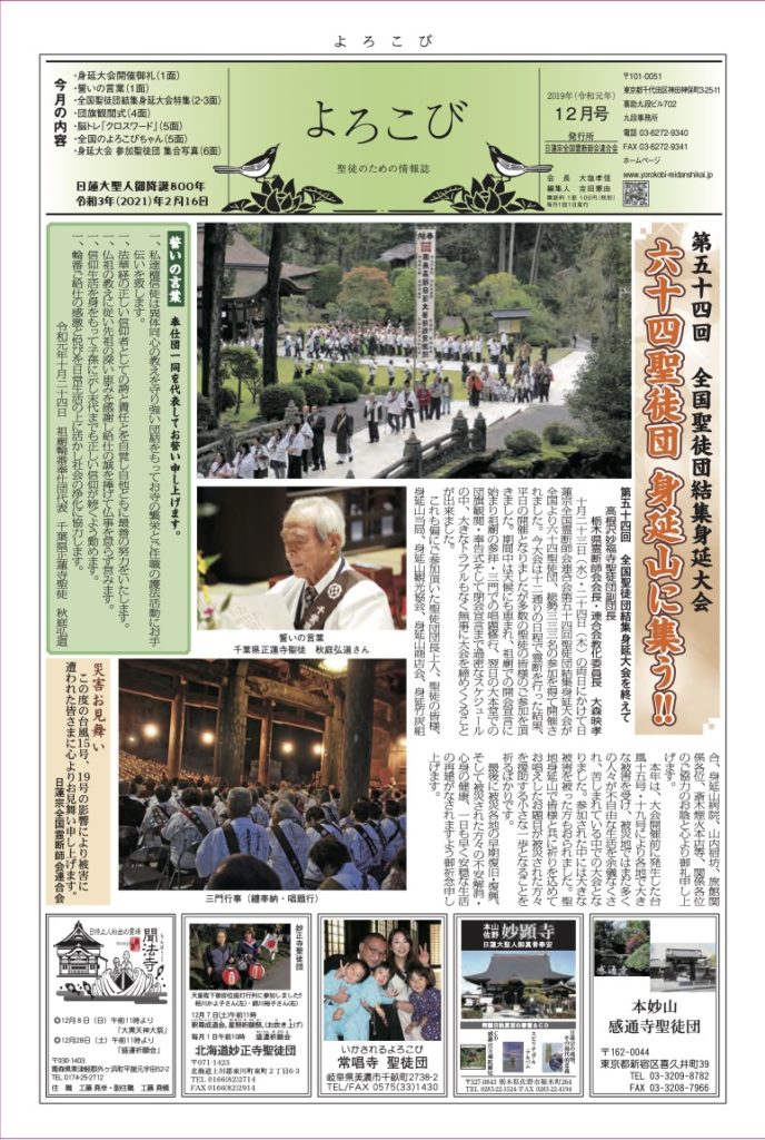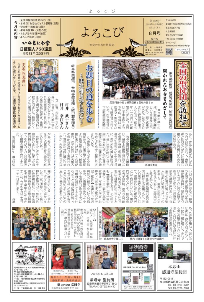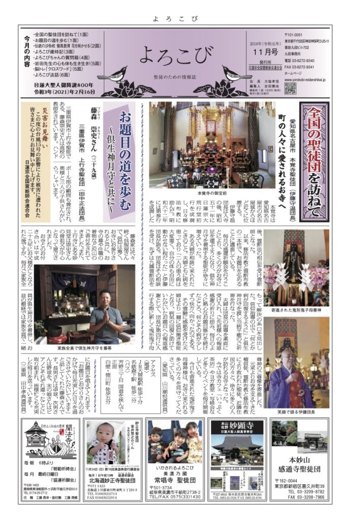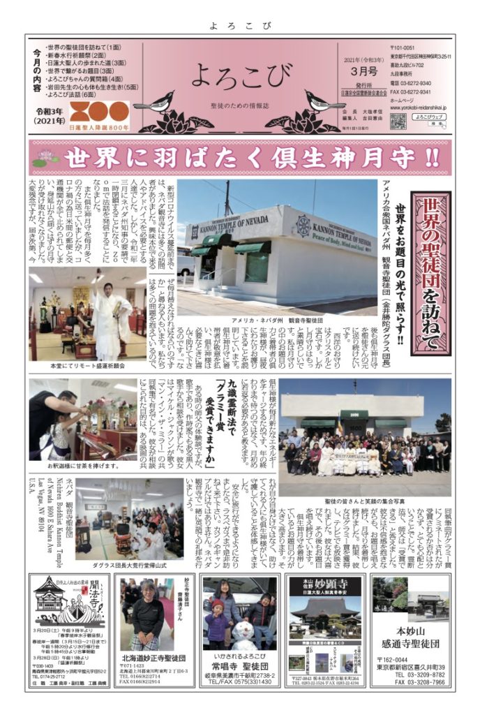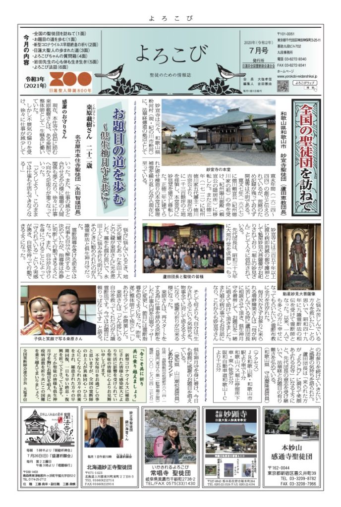 倶生神月守を着帯する檀信徒を「聖徒」と呼び、「聖徒のための情報紙」として全国の聖徒団(当会所属寺院・教会・結社)情報(1面・2面)を発信しています