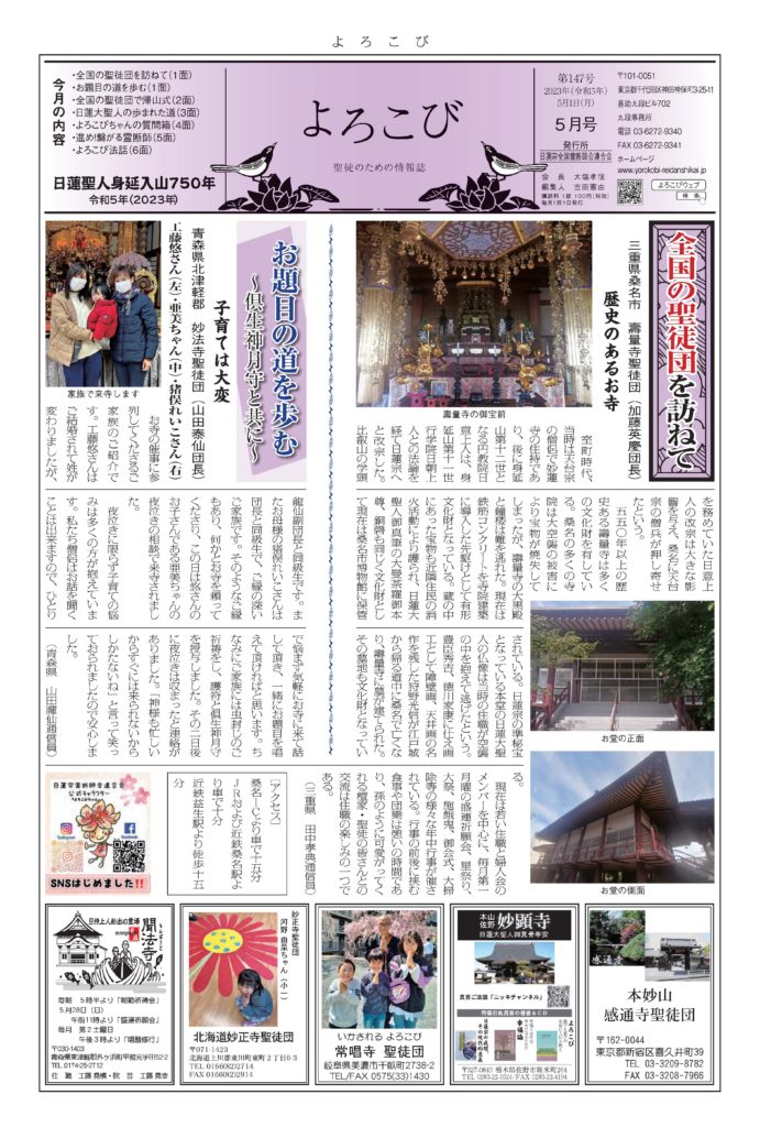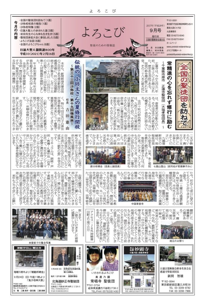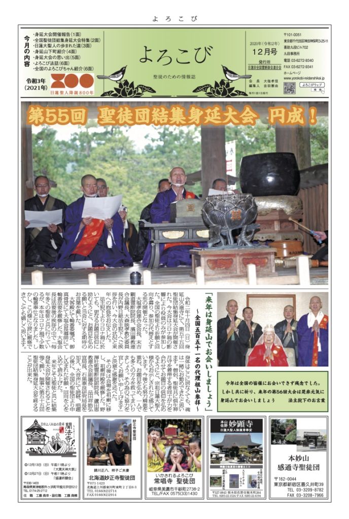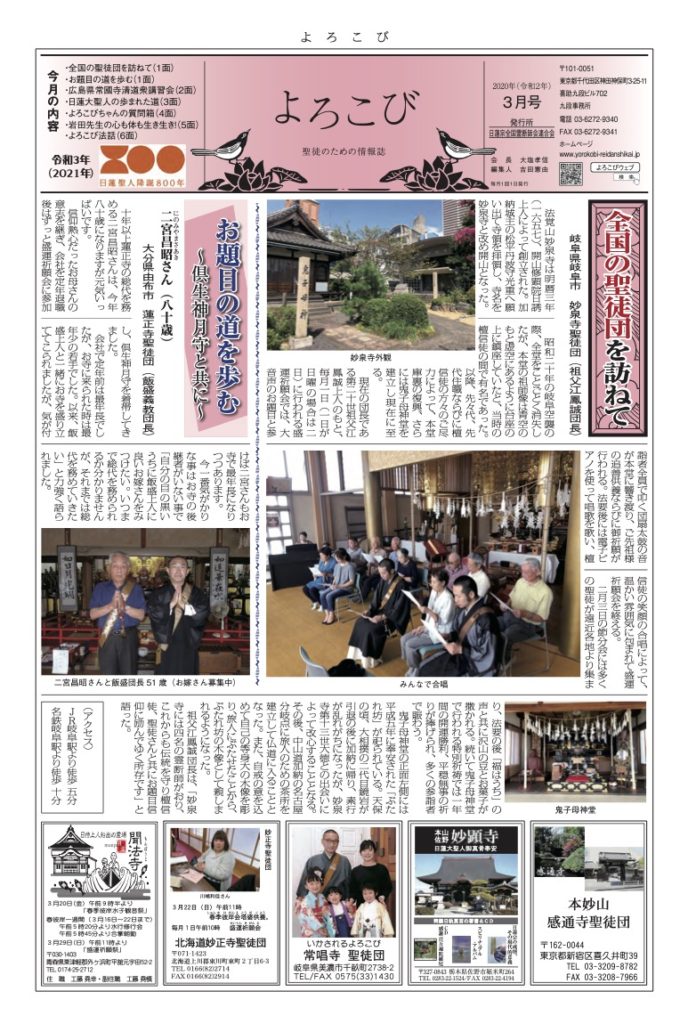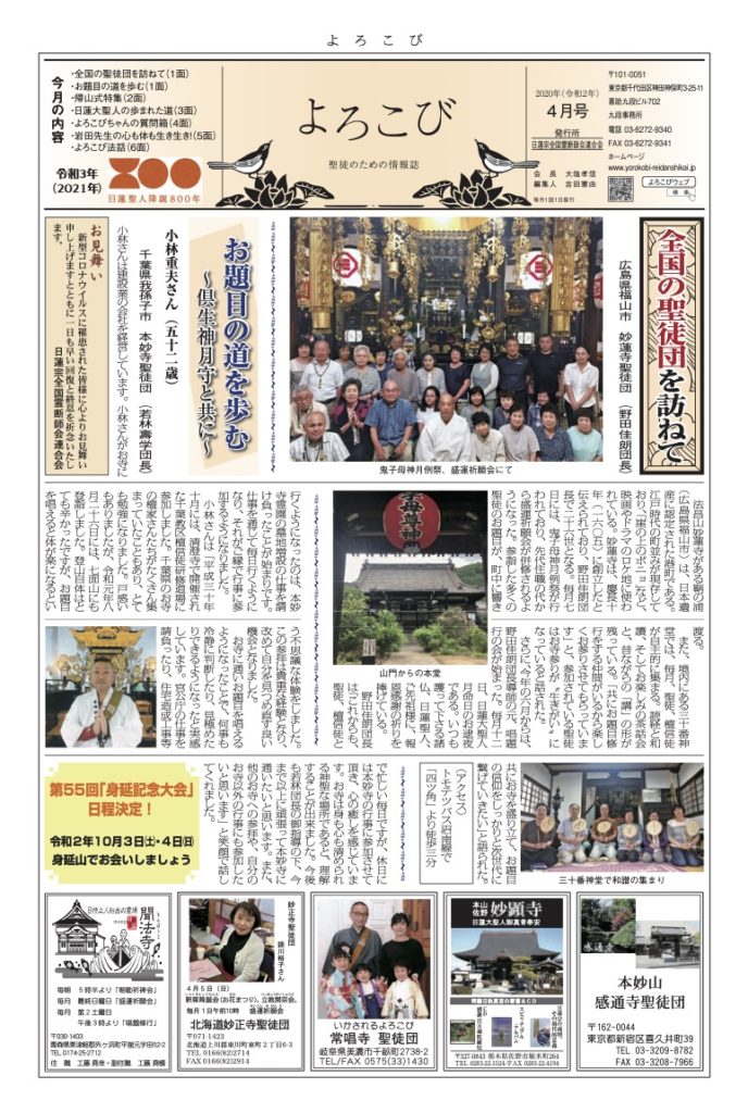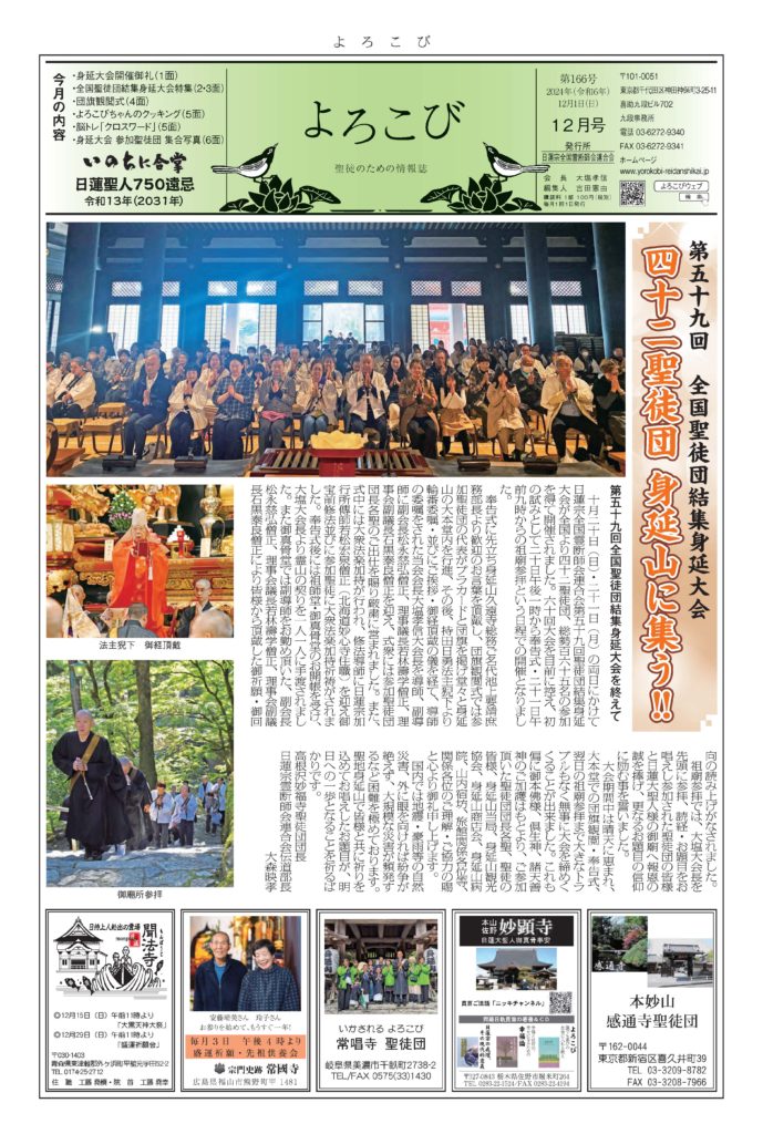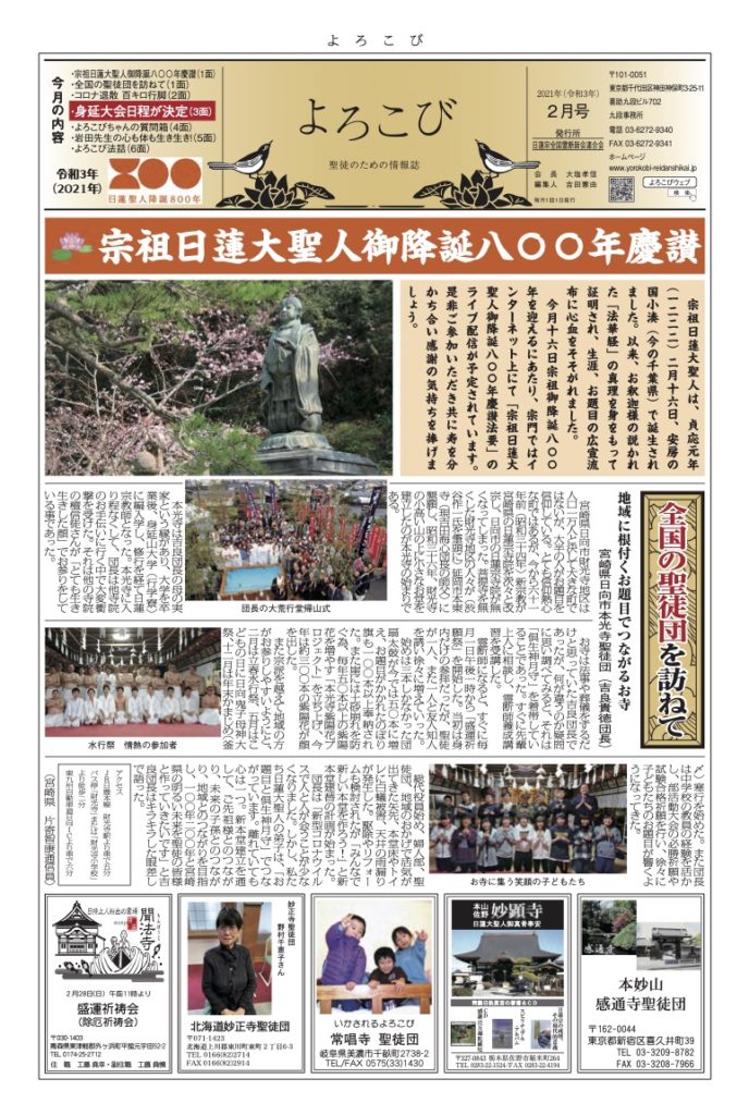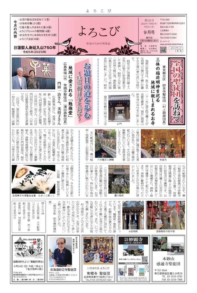倶生神月守を着帯する檀信徒を「聖徒」と呼び、「聖徒のための情報紙」として全国の聖徒団(当会所属寺院・教会・結社)情報(1面・2面)を発信しています